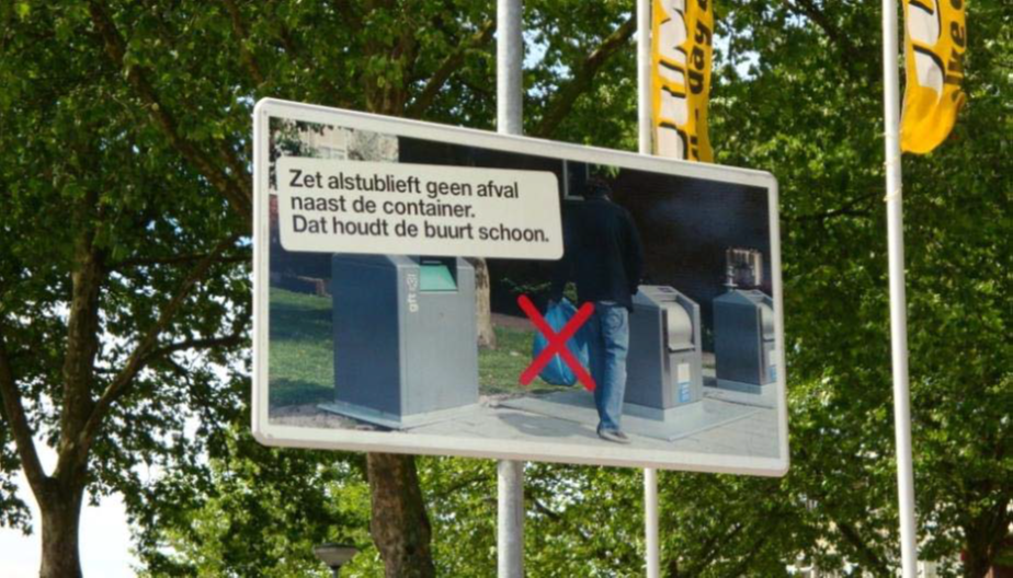 De gemeente Hoogeveen plaatst ‘niet te missen’ stickers op de containers en op de grond. Die stickers lokken goed gedrag uit. De drempel is een stuk hoger om afval te plaatsen boven op een sticker waarop staat ‘Geen afval plaatsen!’ Een duidelijke boodschap, die nog eens wordt benadrukt door de signaalkleur rood. Lees in de Inspiratiegids containerstickers van Rijkswaterstaat, hoe je dit kunt doen.