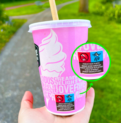 Dit rood-blauwe logo met levenloze zeeschildpad, waarschuwt voor plastic in productverpakkingen. Wereldwijd komt 41% van het plastic in verpakkingen terecht, zoals flessen, wegwerpbekers en chips- en snoepverpakkingen. Als dit plastic gaat zwerven en terecht komt in de natuur, richt het schade aan bij bloemen, planten, bomen, dieren en uiteindelijk ook bij onszelf. Naast zorgen dat je zo min mogelijk producten gebruikt die dit logo hebben, zijn er meer dingen die je kunt doen. Beperk de milieuschade door je eigen herbruikbare beker, bakje of lunchtrommel te gebruiken.